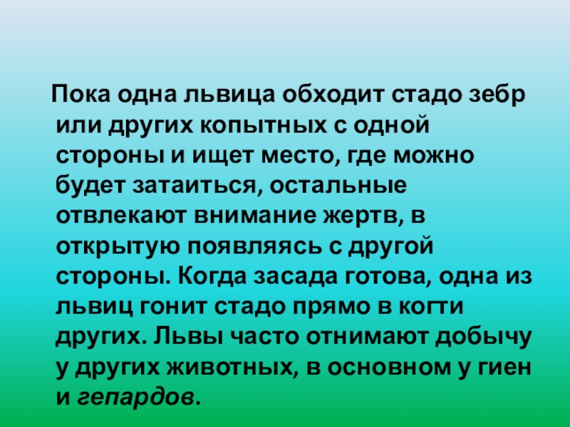 с одной стороны и ищет место, где можно будет затаиться, остальные отвлекают внимание жертв, в открытую появляясь с другой стороны. Когда засада готова, одна из львиц гонит стадо прямо в когти других. Львы часто отнимают добычу у других животных, в основном у гиен и гепардов.