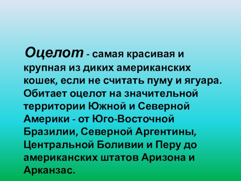 кошек, если не считать пуму и ягуара. Обитает оцелот на значительной территории Южной и Северной Америки - от Юго-Восточной Бразилии, Северной Аргентины, Центральной Боливии и Перу до американских штатов Аризона и Арканзас.