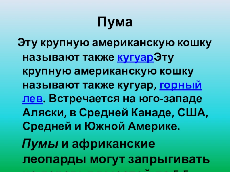 называют также кугуар, горный лев. Встречается на юго-западе Аляски, в Средней Канаде, США, Средней и Южной Америке.