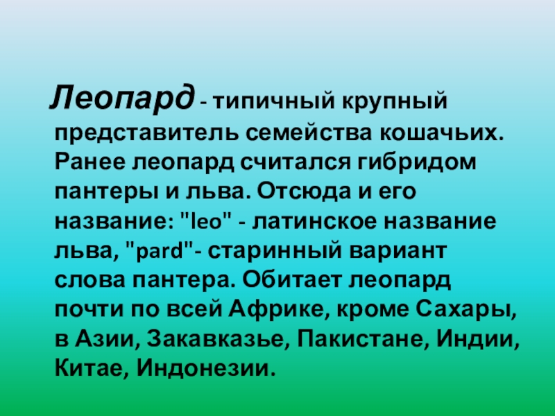 считался гибридом пантеры и льва. Отсюда и его название: "leo" - латинское название льва, "pard"- старинный вариант слова пантера. Обитает леопард почти по всей Африке, кроме Сахары, в Азии, Закавказье, Пакистане, Индии, Китае, Индонезии.