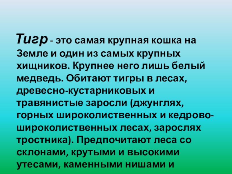 один из самых крупных хищников. Крупнее него лишь белый медведь. Обитают тигры в лесах, древесно-кустарниковых и травянистые заросли (джунглях, горных широколиственных и кедрово-широколиственных лесах, зарослях тростника). Предпочитают леса со склонами, крутыми и высокими утесами, каменными нишами и пещерами.