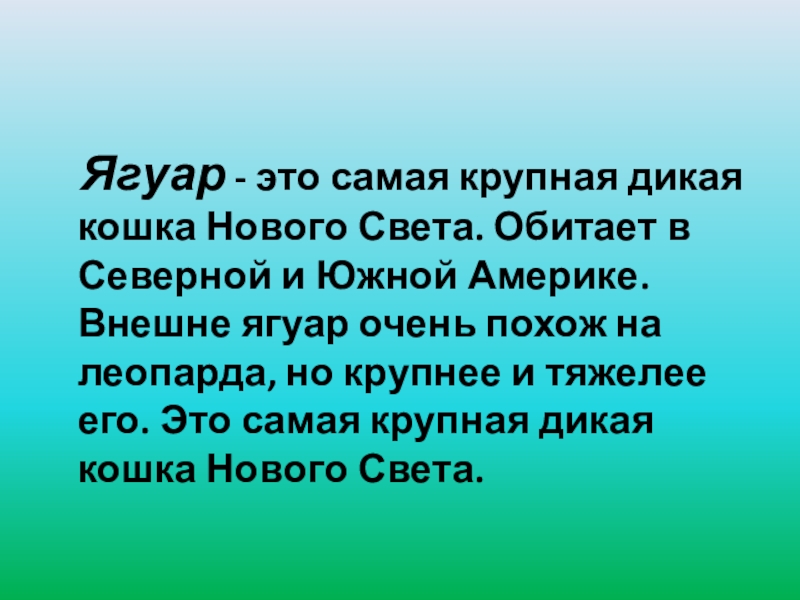 Обитает в Северной и Южной Америке. Внешне ягуар очень похож на леопарда, но крупнее и тяжелее его. Это самая крупная дикая кошка Нового Света.