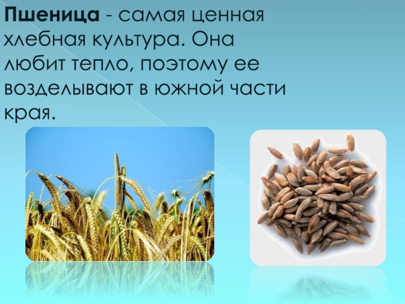 Пшеница - самая ценная хлебная культура. Она любит тепло, поэтому ее возделывают в южной части края.
