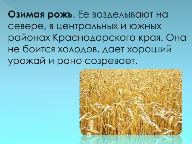 Слайд 2Озимая рожь. Ее возделывают на севере, в центральных и южных районах
