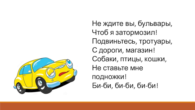 Не ждите вы, бульвары,Чтоб я затормозил!Подвиньтесь, тротуары, С дороги, магазин!Собаки, птицы, кошки,Не ставьте мне подножки!Би-би, би-би, би-би!