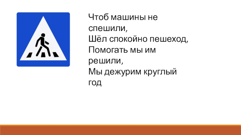 Чтоб машины не спешили,Шёл спокойно пешеход, Помогать мы им решили,Мы дежурим круглый год