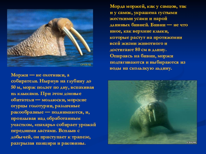 Моржи — не охотники, а собиратели. Нырнув на глубину до 50 м, морж ползет по дну, вспахивая ил клыками. При этом донные обитатели — моллюски, морские огурцы голотурии, различные ракообразные — поднимаются, и, проплывая над обработанным участком, «пахарь» собирает урожай передними ластами. Всплыв с добычей, он приступает к трапезе, разгрызая панцири и раковины.