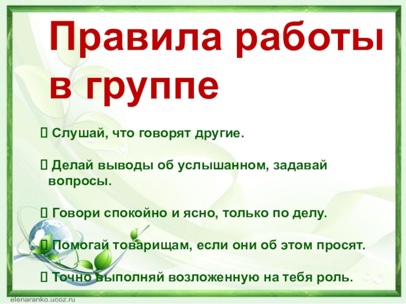 Правила работы в группе Слушай, что говорят другие. Делай выводы об услышанном, задавай вопросы. Говори спокойно и