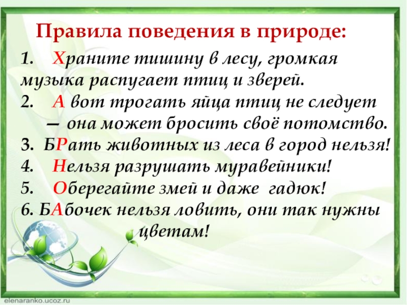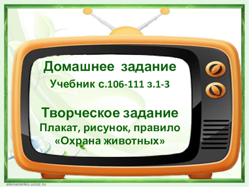 Домашнее заданиеУчебник с.106-111 з.1-3Творческое заданиеПлакат, рисунок, правило«Охрана животных»