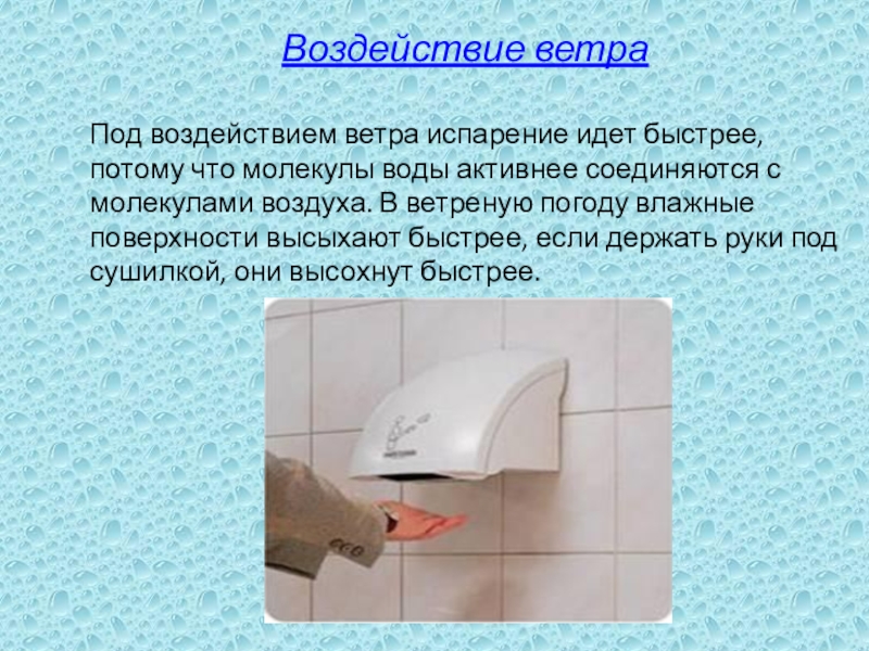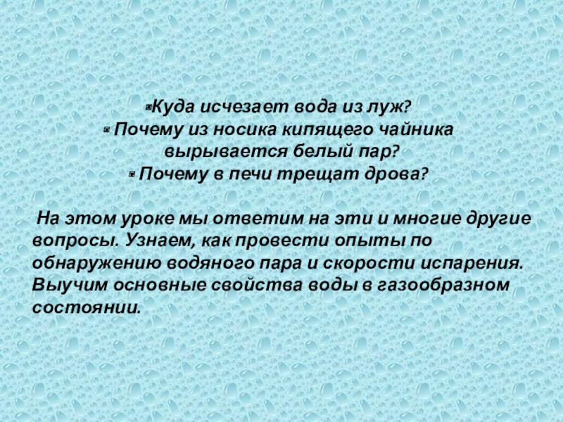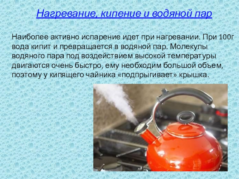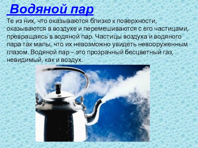 Те из них, что оказываются близко к поверхности, оказываются в воздухе и перемешиваются с его частицами, превращаясь в водяной пар. Частицы воздуха и водяного пара так малы, что их невозможно увидеть невооруженным глазом. Водяной пар – это прозрачный бесцветный газ, невидимый, как и воздух.