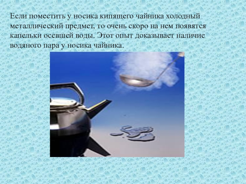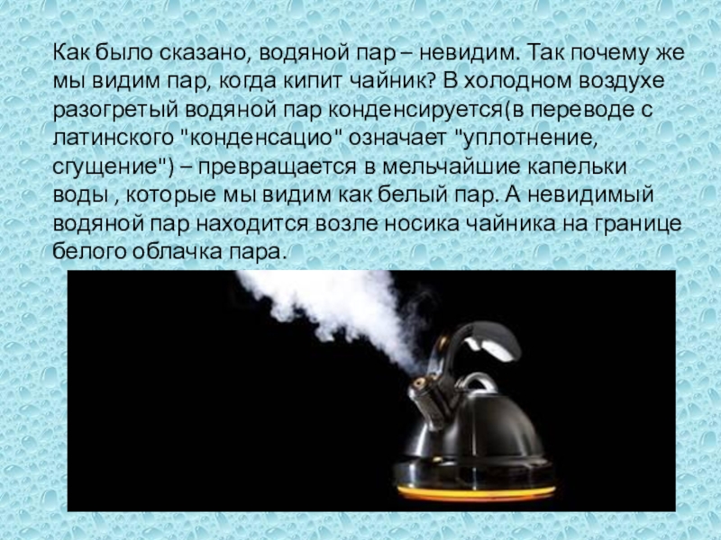 Как было сказано, водяной пар – невидим. Так почему же мы видим пар, когда кипит чайник? В холодном воздухе разогретый водяной пар конденсируется(в переводе с латинского "конденсацио" означает "уплотнение, сгущение") – превращается в мельчайшие капельки воды , которые мы видим как белый пар. А невидимый водяной пар находится возле носика чайника на границе белого облачка пара.