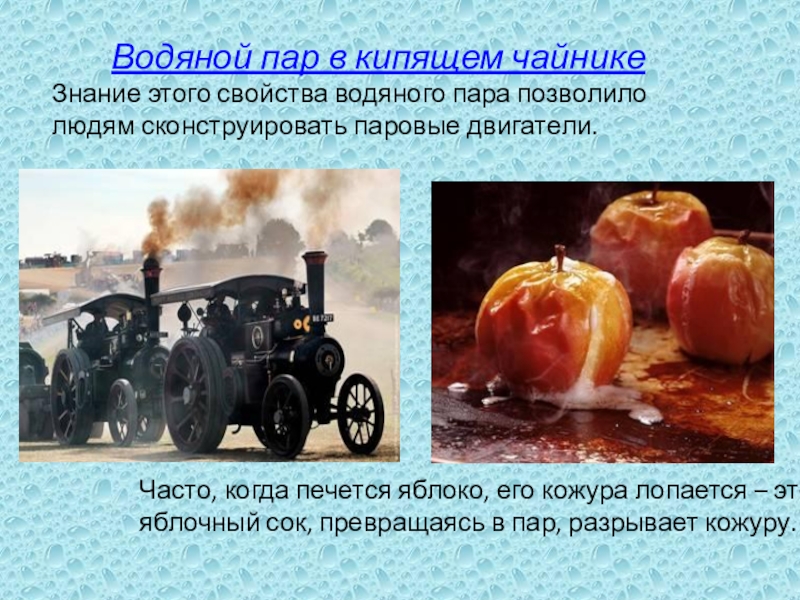 Часто, когда печется яблоко, его кожура лопается – это яблочный сок, превращаясь в пар, разрывает кожуру.