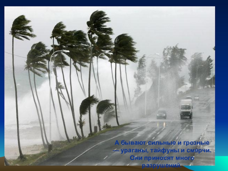 А бывают сильные и грозные — ураганы, тайфуны и смерчи.