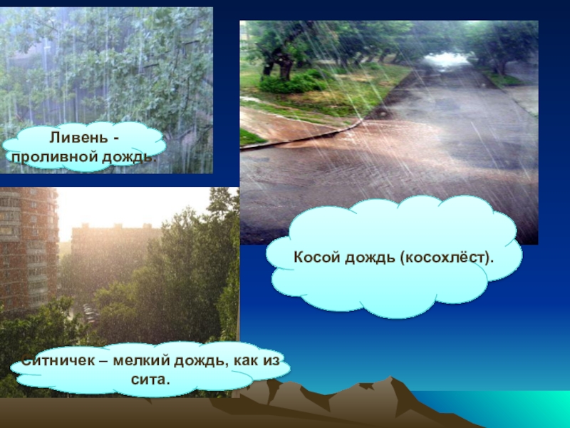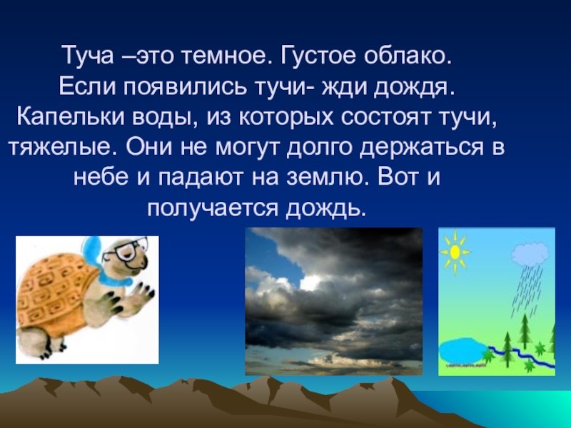 которых состоят тучи, тяжелые. Они не могут долго держаться в небе и падают на землю. Вот и получается дождь.