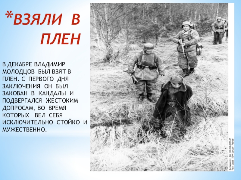 ВЗЯЛИ В ПЛЕНВ ДЕКАБРЕ ВЛАДИМИР МОЛОДЦОВ БЫЛ ВЗЯТ В ПЛЕН. С ПЕРВОГО ДНЯ ЗАКЛЮЧЕНИЯ ОН БЫЛ ЗАКОВАН