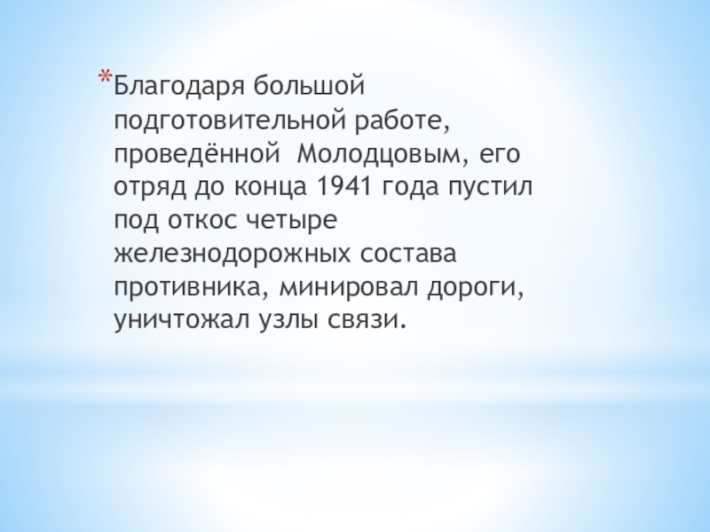 Слайд 9Благодаря большой подготовительной работе, проведённой Молодцовым, его отряд до конца 1941