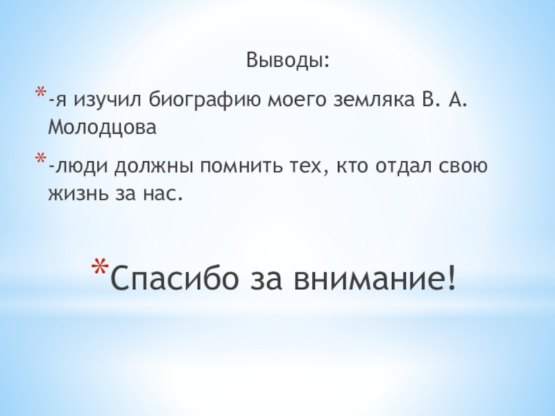 Выводы:-я изучил биографию моего земляка В. А. Молодцова-люди должны помнить тех, кто отдал свою жизнь за нас.Спасибо