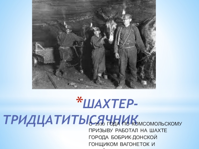 ШАХТЕР-ТРИДЦАТИТЫСЯЧНИКС 1930 ГОДА ПО КОМСОМОЛЬСКОМУ ПРИЗЫВУ РАБОТАЛ НА ШАХТЕ ГОРОДА БОБРИК-ДОНСКОЙ ГОНЩИКОМ ВАГОНЕТОК И ЗАБОЙЩИКОМ.