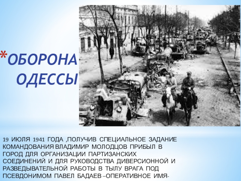 ОБОРОНА ОДЕССЫ19 ИЮЛЯ 1941 ГОДА ,ПОЛУЧИВ СПЕЦИАЛЬНОЕ ЗАДАНИЕ КОМАНДОВАНИЯ ВЛАДИМИР МОЛОДЦОВ ПРИБЫЛ В ГОРОД ДЛЯ ОРГАНИЗАЦИИ ПАРТИЗАНСКИХ