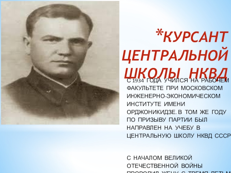 КУРСАНТ ЦЕНТРАЛЬНОЙ ШКОЛЫ НКВДС 1934 ГОДА УЧИЛСЯ НА РАБОЧЕМ ФАКУЛЬТЕТЕ ПРИ МОСКОВСКОМ ИНЖЕНЕРНО-ЭКОНОМИЧЕСКОМ ИНСТИТУТЕ ИМЕНИ ОРДЖОНИКИДЗЕ. В