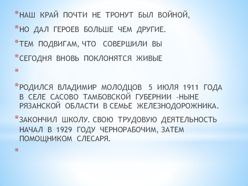 РОДИЛСЯ ВЛАДИМИР МОЛОДЦОВ 5 ИЮЛЯ 1911 ГОДА В СЕЛЕ САСОВО ТАМБОВСКОЙ ГУБЕРНИИ -НЫНЕ РЯЗАНСКОЙ ОБЛАСТИ В СЕМЬЕ ЖЕЛЕЗНОДОРОЖНИКА.