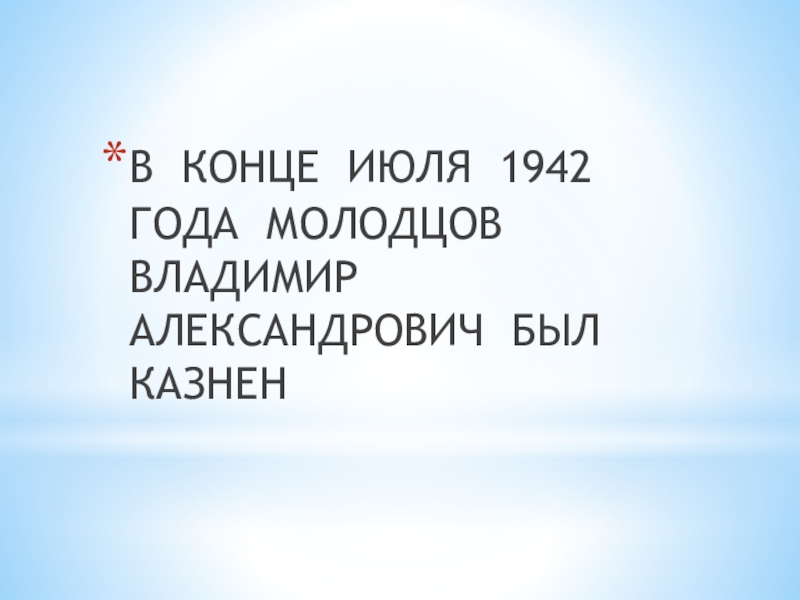 Слайд 15В КОНЦЕ ИЮЛЯ 1942 ГОДА МОЛОДЦОВ ВЛАДИМИР АЛЕКСАНДРОВИЧ БЫЛ КАЗНЕН
