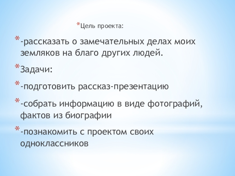 Цель проекта:-рассказать о замечательных делах моих земляков на благо других людей.Задачи:-подготовить рассказ-презентацию-собрать информацию в виде фотографий, фактов из биографии-познакомить с проектом своих одноклассников