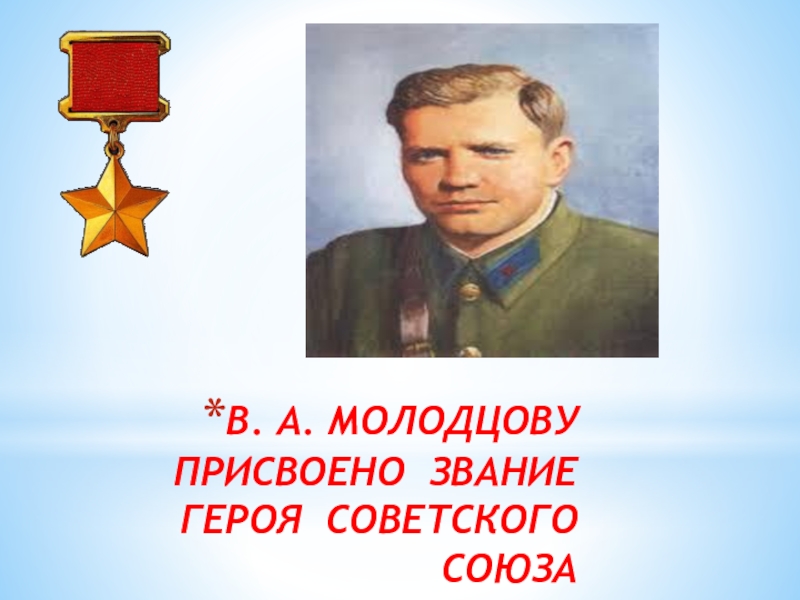 Слайд 17В. А. МОЛОДЦОВУ ПРИСВОЕНО ЗВАНИЕ ГЕРОЯ СОВЕТСКОГО СОЮЗА