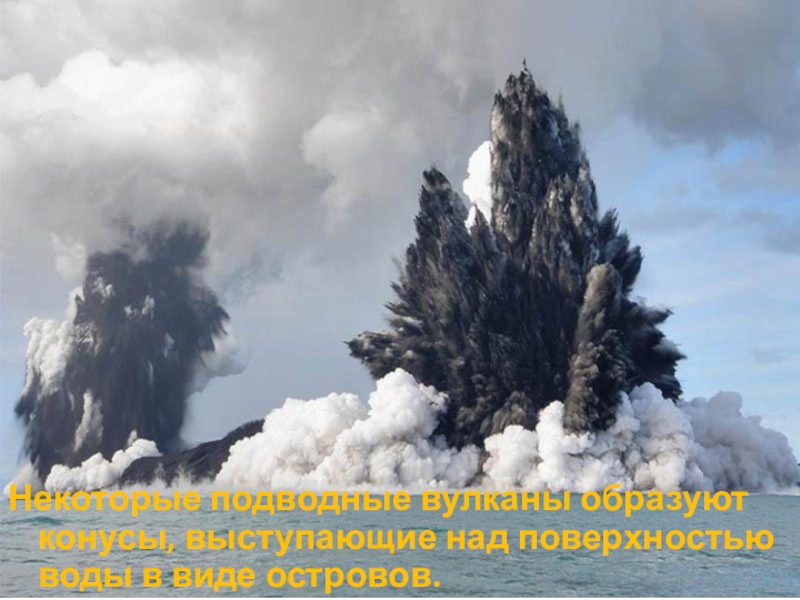 Слайд 32Некоторые подводные вулканы образуют конусы, выступающие над поверхностью воды в виде