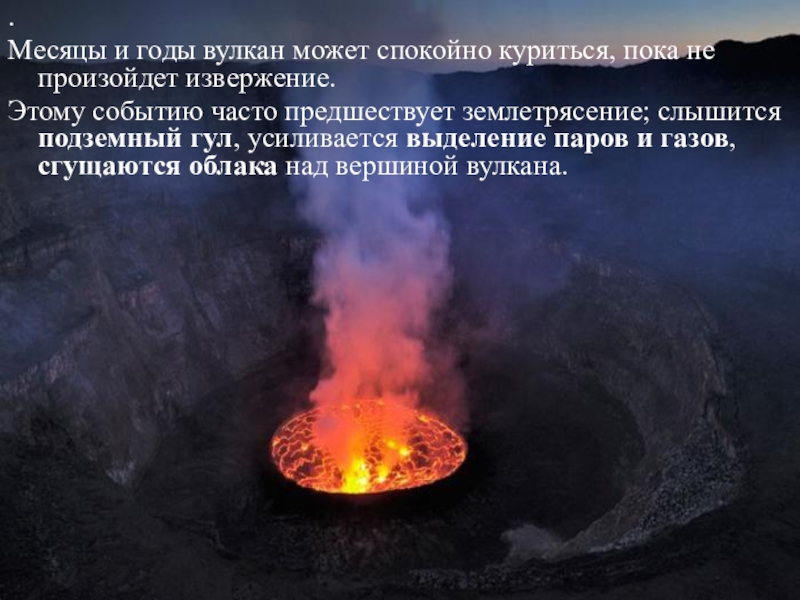. Месяцы и годы вулкан может спокойно куриться, пока не произойдет извержение. Этому событию часто предшествует землетрясение;