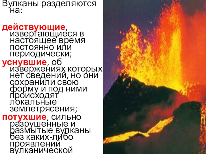 Вулканы разделяются на:действующие, извергающиеся в настоящее время постоянно или периодически;уснувшие, об извержениях которых нет сведений, но они