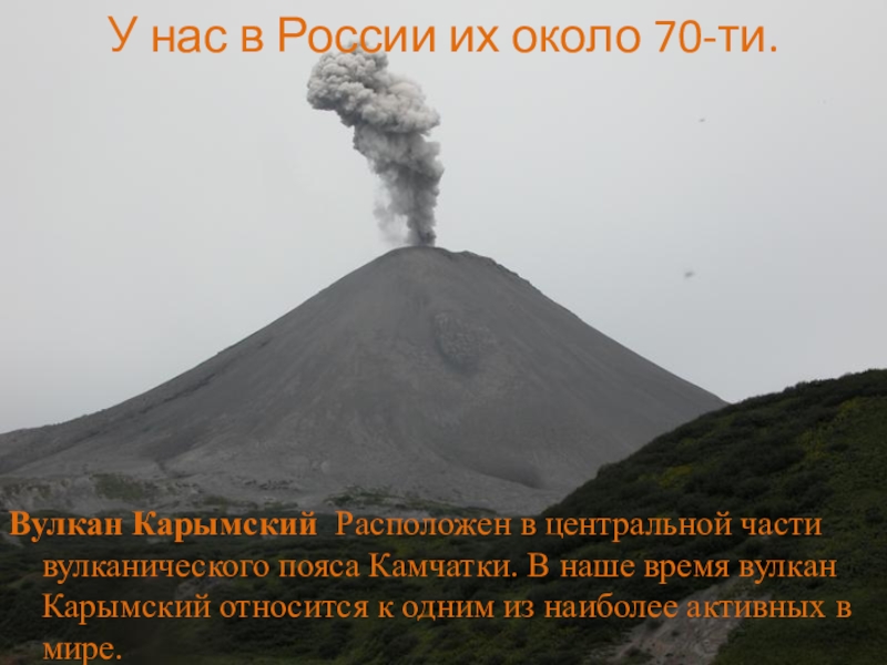 У нас в России их около 70-ти.Вулкан Карымский Расположен в центральной части вулканического пояса Камчатки. В наше