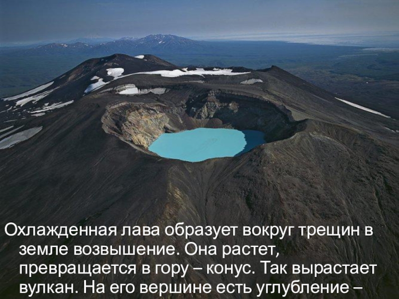 Слайд 8Охлажденная лава образует вокруг трещин в земле возвышение. Она растет, превращается