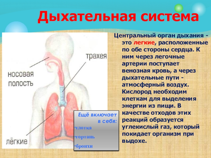 Центральный орган дыхания - это легкие, расположенные по обе стороны сердца. К ним через легочные артерии поступает венозная кровь, а через дыхательные пути - атмосферный воздух. Кислород необходим клеткам для выделения энергии из пищи. В качестве отходов этих реакций образуется углекислый газ, который покидает организм при выдохе.