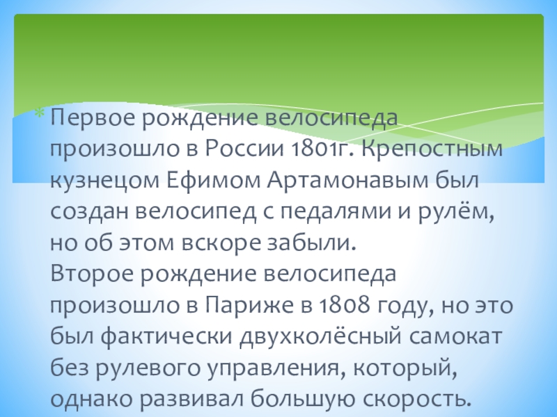 Первое рождение велосипеда произошло в России 1801г. Крепостным кузнецом Ефимом Артамонавым был создан велосипед с педалями и рулём, но об этом вскоре забыли. Второе рождение велосипеда произошло в Париже в 1808 году, но это был фактически