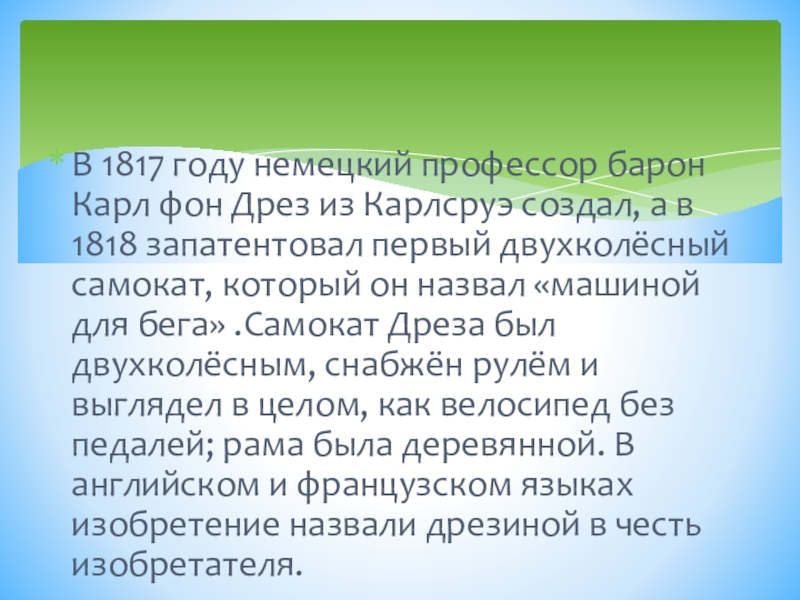создал, а в 1818 запатентовал первый двухколёсный самокат, который он назвал «машиной для бега» .Самокат Дреза был двухколёсным, снабжён рулём и выглядел в целом, как велосипед без педалей; рама была деревянной. В английском и французском языках изобретение назвали дрезиной в честь изобретателя.