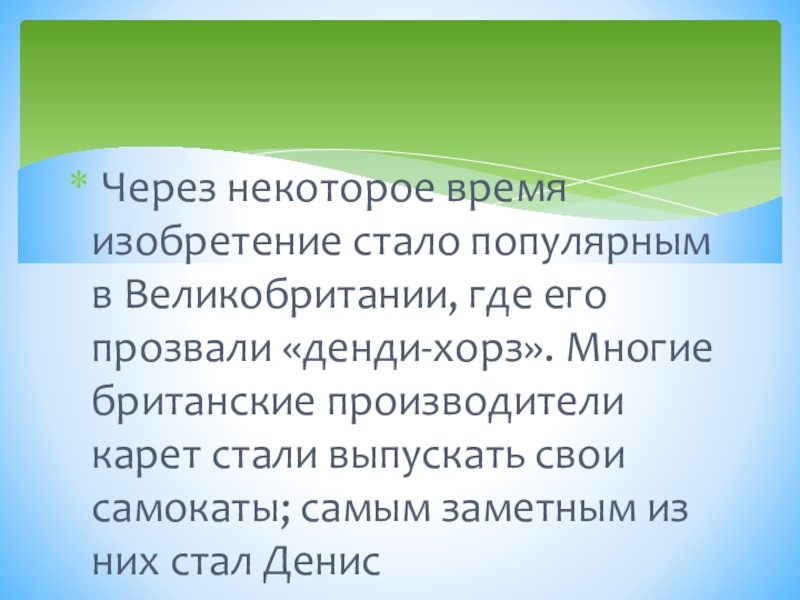 прозвали «денди-хорз». Многие британские производители карет стали выпускать свои самокаты; самым заметным из них стал Денис