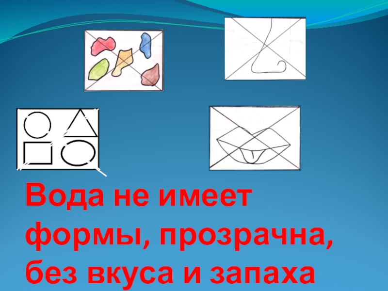 Вода не имеет    формы, прозрачна,      без вкуса и запаха