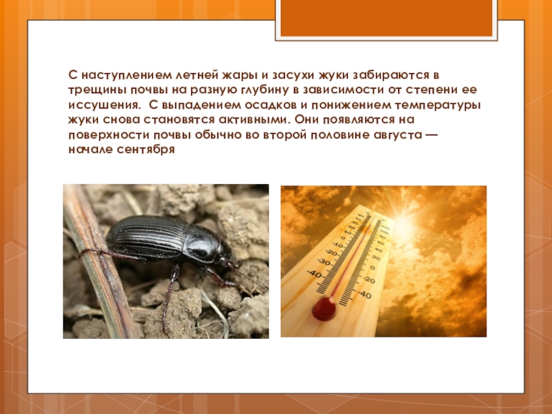 Слайд 4С наступлением летней жары и засухи жуки забираются в трещины почвы