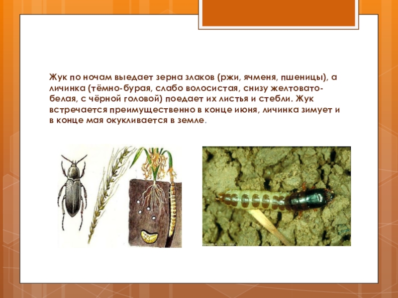 Слайд 3Жук по ночам выедает зерна злаков (ржи, ячменя, пшеницы), а личинка