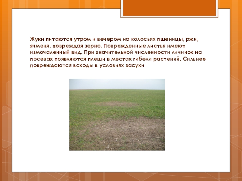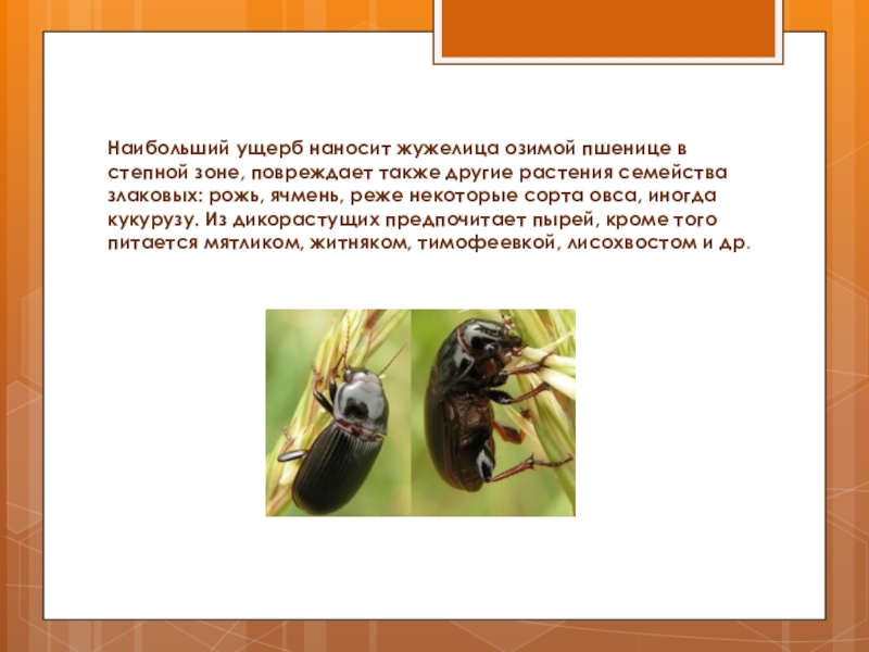 Слайд 5Жуки питаются утром и вечером на колосьях пшеницы, ржи, ячменя, повреждая