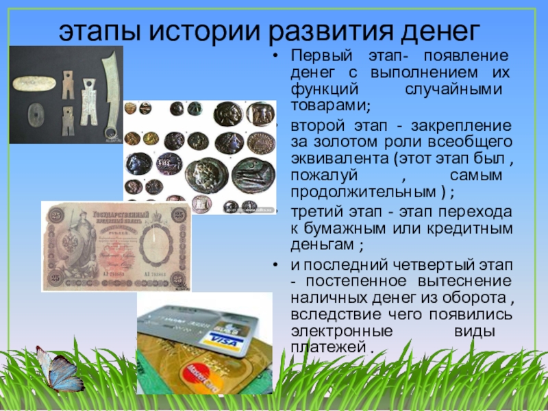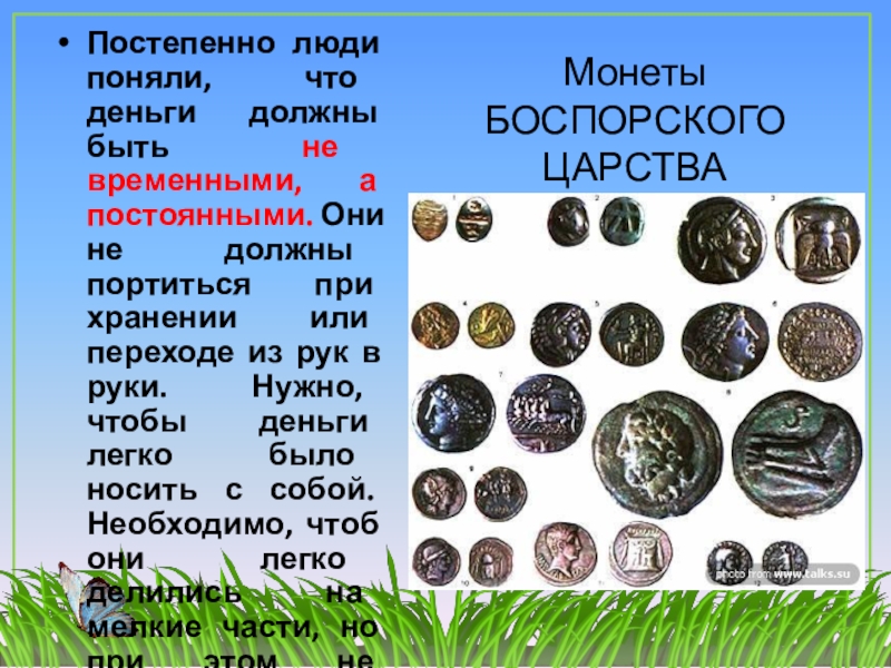 Слайд 22Постепенно люди поняли, что деньги должны быть не временными, а постоянными.