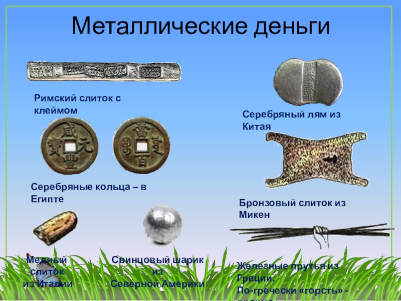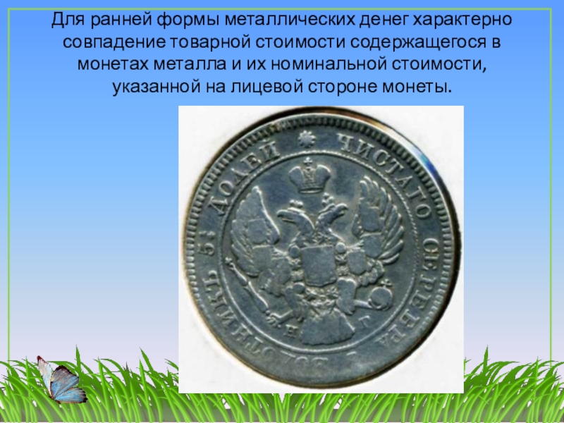 Слайд 27Для ранней формы металлических денег характерно совпадение товарной стоимости содержащегося в