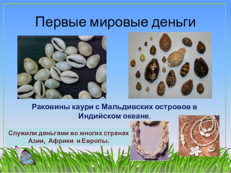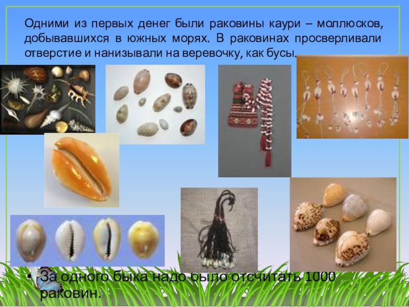 Слайд 16Одними из первых денег были раковины каури – моллюсков, добывавшихся в