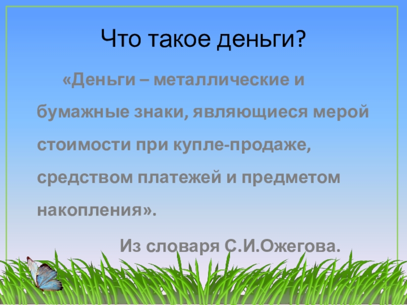 бумажные знаки, являющиеся мерой стоимости при купле-продаже, средством платежей и предметом накопления».