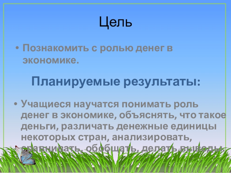 в экономике, объяснять, что такое деньги, различать денежные единицы некоторых стран, анализировать, сравнивать, обобщать, делать выводы.