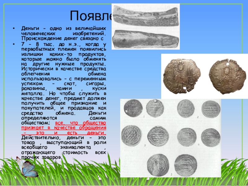 7 - 8 тыс. до н.э., когда у первобытных племен появились излишки каких-то продуктов, которые можно было обменять на другие нужные продукты. Исторически в качестве средства облегчения обмена использовались - с переменным успехом - скот, сигары, раковины, камни , куски металла. Но чтобы служить в качестве денег, предмет должен получить общее признание и покупателей, и продавцов как средство обмена. Деньги определяются самим обществом; все, что общество признает в качестве обращения ,- это и есть деньги. Действительно, деньги - это товар , выступающий в роли всеобщего эквивалента , отражающего стоимость всех прочих товаров.