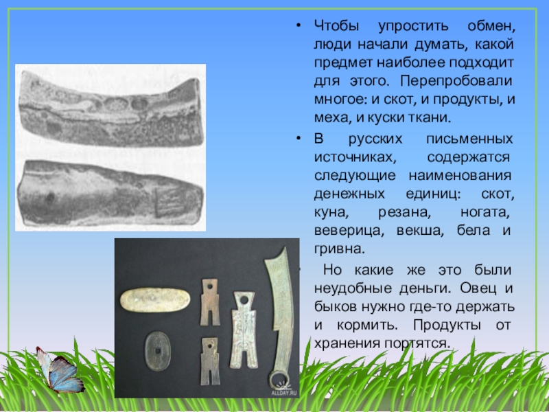 Но какие же это были неудобные деньги. Овец и быков нужно где-то держать и кормить. Продукты от хранения портятся.