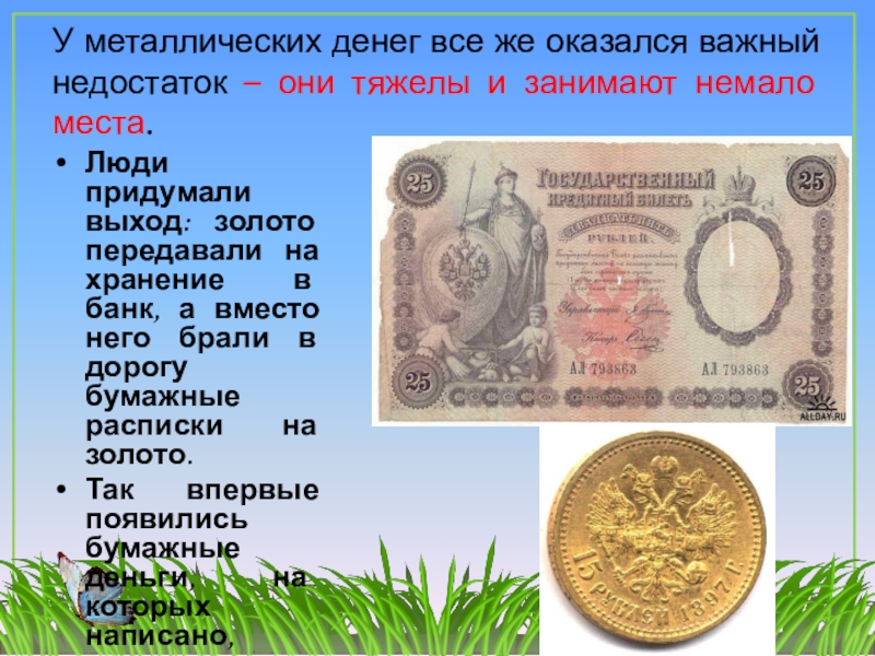 Слайд 29Люди придумали выход: золото передавали на хранение в банк, а вместо