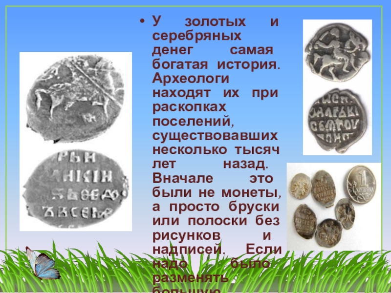 Слайд 26У золотых и серебряных денег самая богатая история. Археологи находят их
